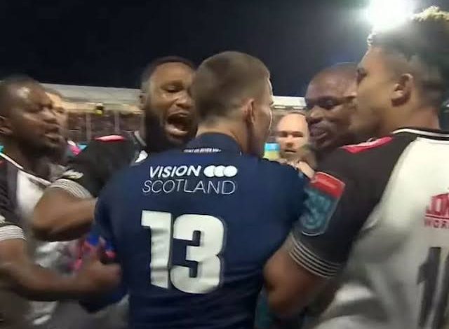 However, in the process of scoring, Edinburgh’s full-back Harry Paterson dived on top of him and hit him with his knee as he tried to stop him scoring. Despite just winning the game for his team, Mapimpi squared up to Paterson and screamed in his face.