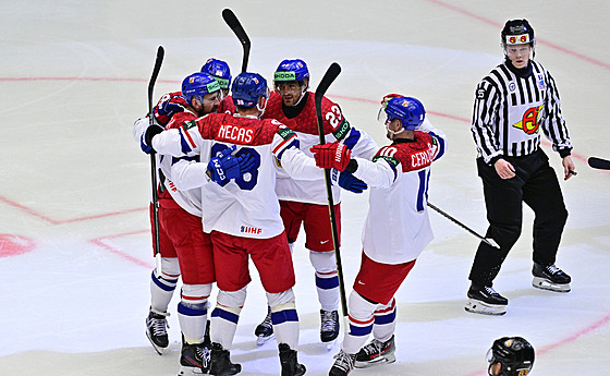 Čeští hokejisté se radují z gólu v utkání proti Německu, který vstřelil David…